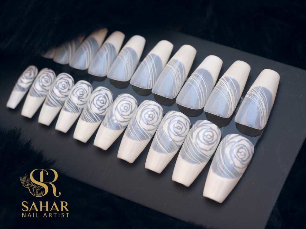 •العلبة تحتوي على 10 اظافر مرسومة و 10 أظافر سادة تقومين بتنسيقها حسب ذوقك.